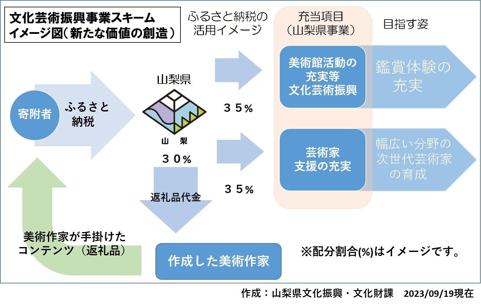 山梨県は、この新たな価値創造の一環として、県の事業に携わった現代美術作家が手掛けるコンテンツをふるさと納税の返礼品とし、その寄附金を美術館活動を含む文化芸術振興および幅広い分野の芸術家への支援・育成へと活用します。